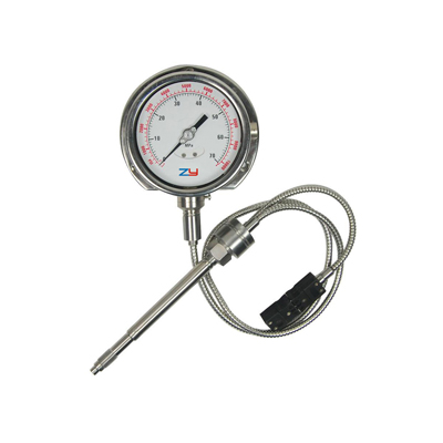 PT135GW柔性管变送输出压力、温度双测量压力表加装测温传感器,实现压力温度同点位测量。并且输出放大信号。膜片隔离、压力现场指针指示,美国原装机芯,表壳任意360度调整最佳可视角度。仪表内配置高精度压力、温度传感器模拟量输出。